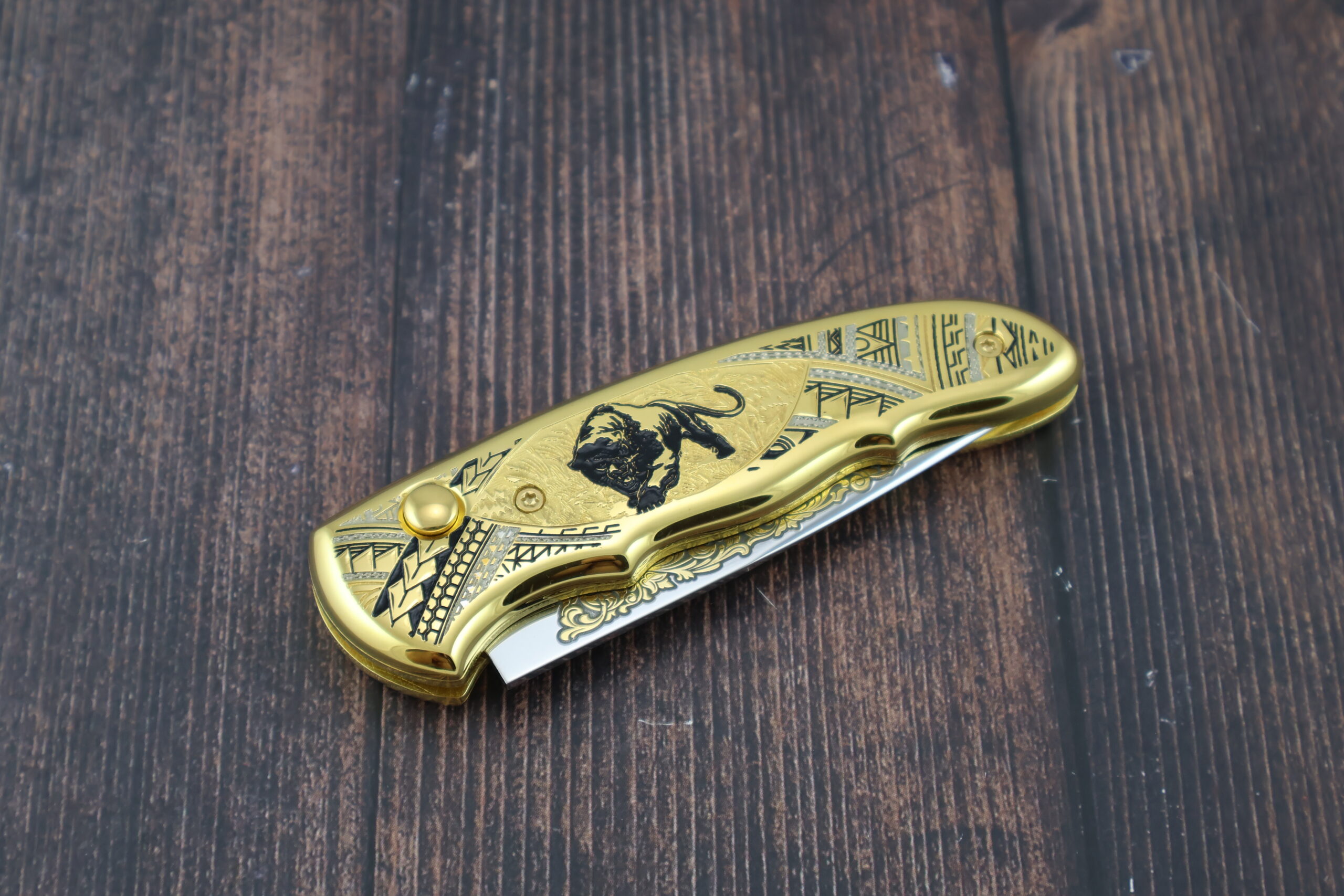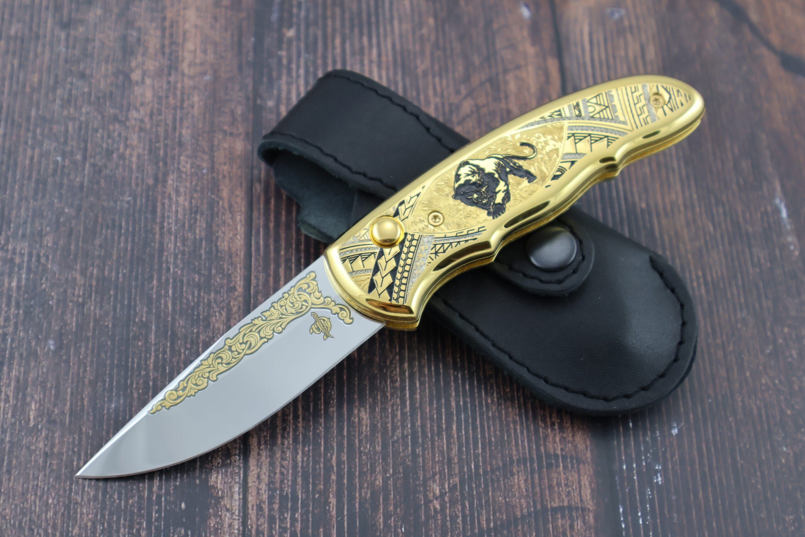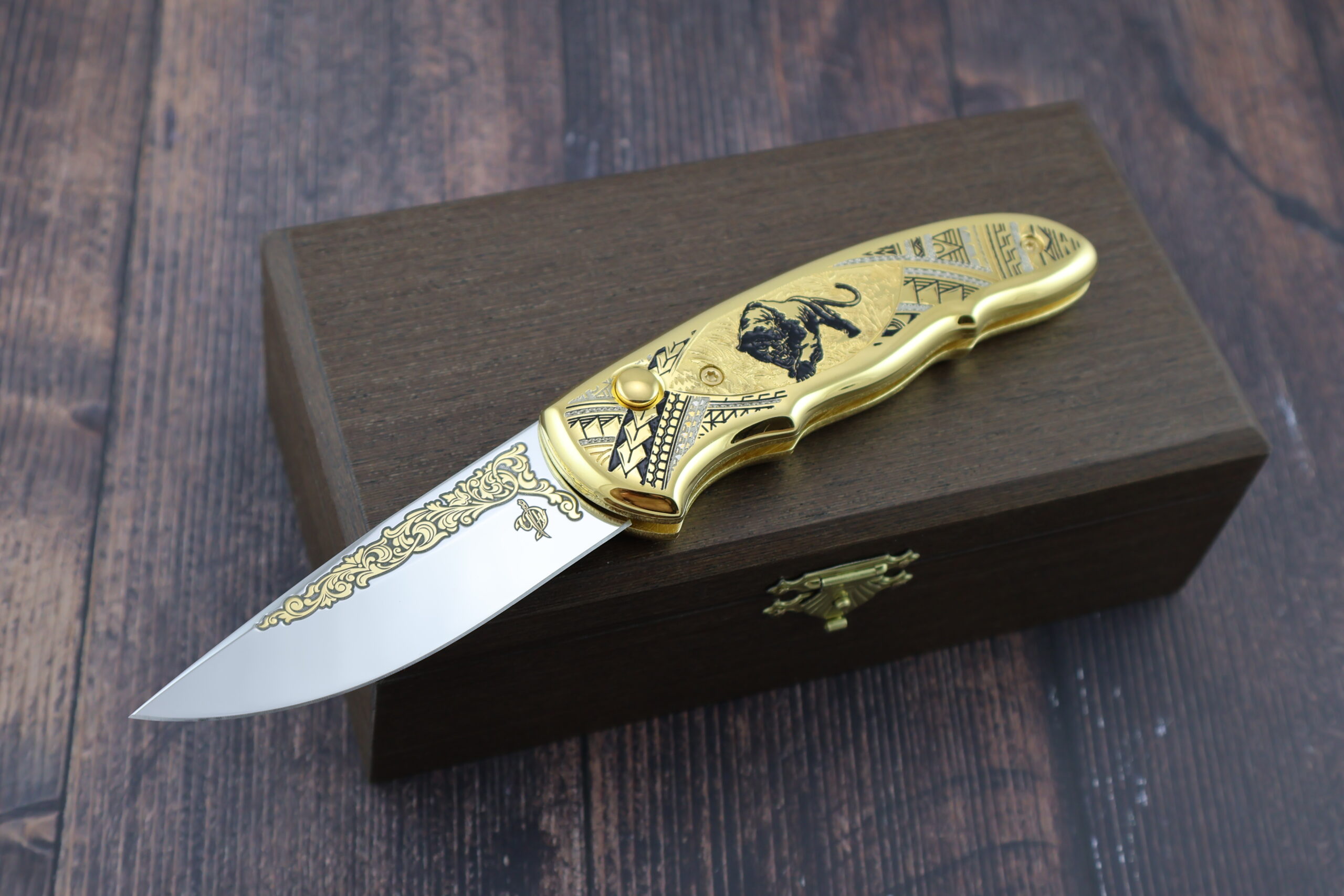 Представляем подарочный складной автоматический нож НС-1м «Чёрная пантера», изготовленный в традициях знаменитой златоустовской гравюры на стали. Изделие создано с применением золочения(используется золто 999-й пробы), никелирования и чернения. Сюжет: на металлической поверхности рукояти изображен силуэт чёрной пантеры на фоне растительного орнамента и геометрических узоров. Клинок выполнен из высококачественной кованой нержавеющей стали ЭИ-107. Только, взяв в руку и испытав неоднократно, можно по достоинству оценить красоту и надежность нашего изделия. Это отличный подарок для каждого мужчины!