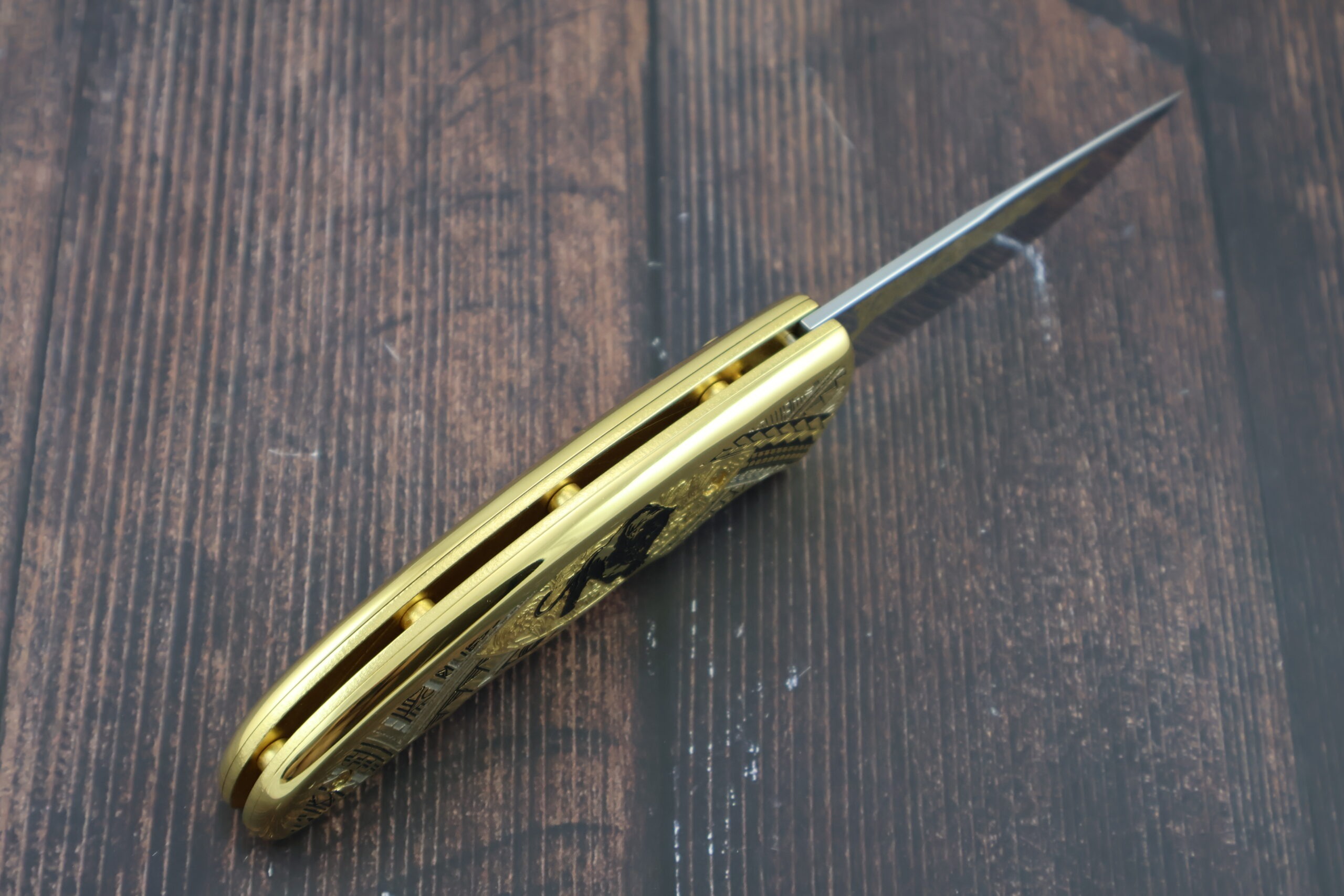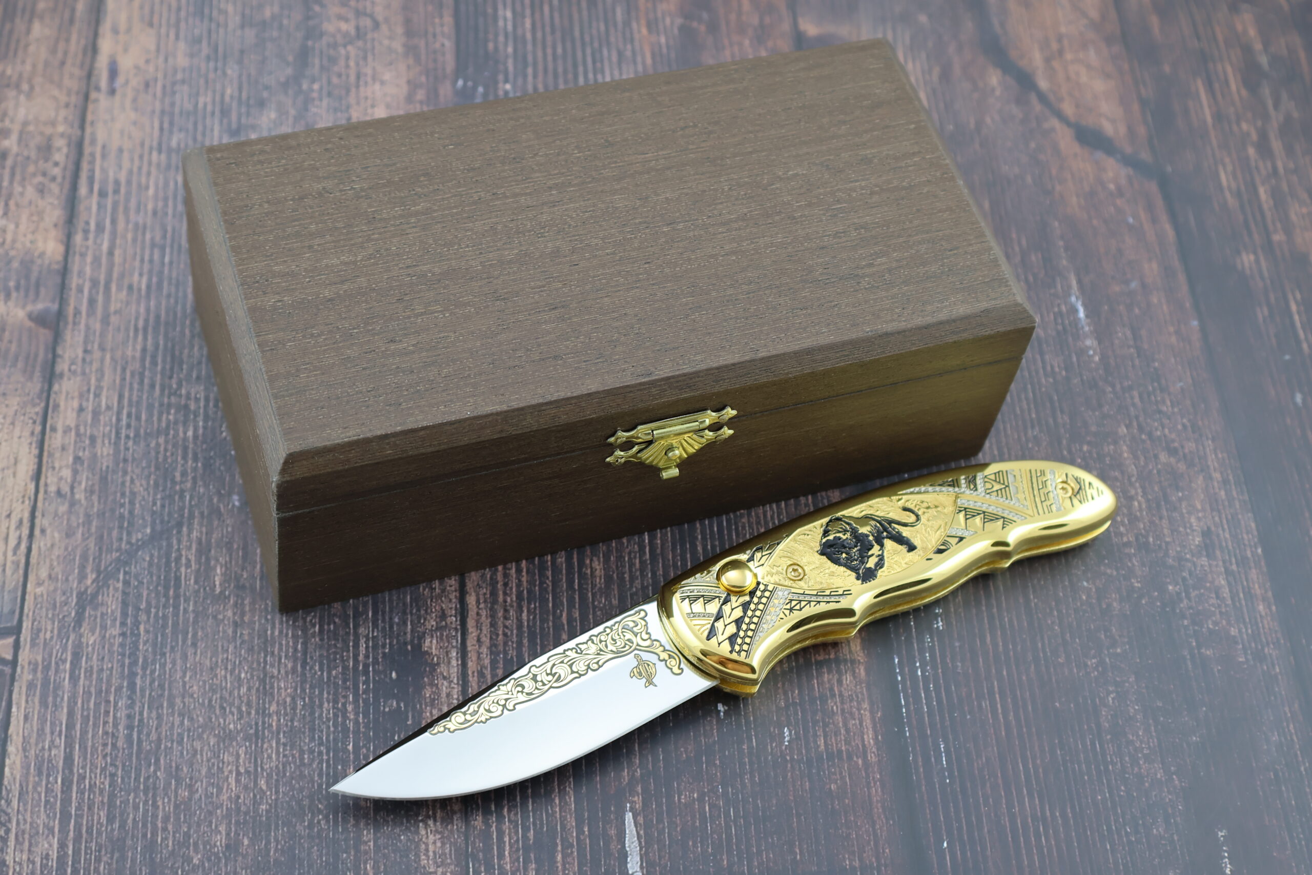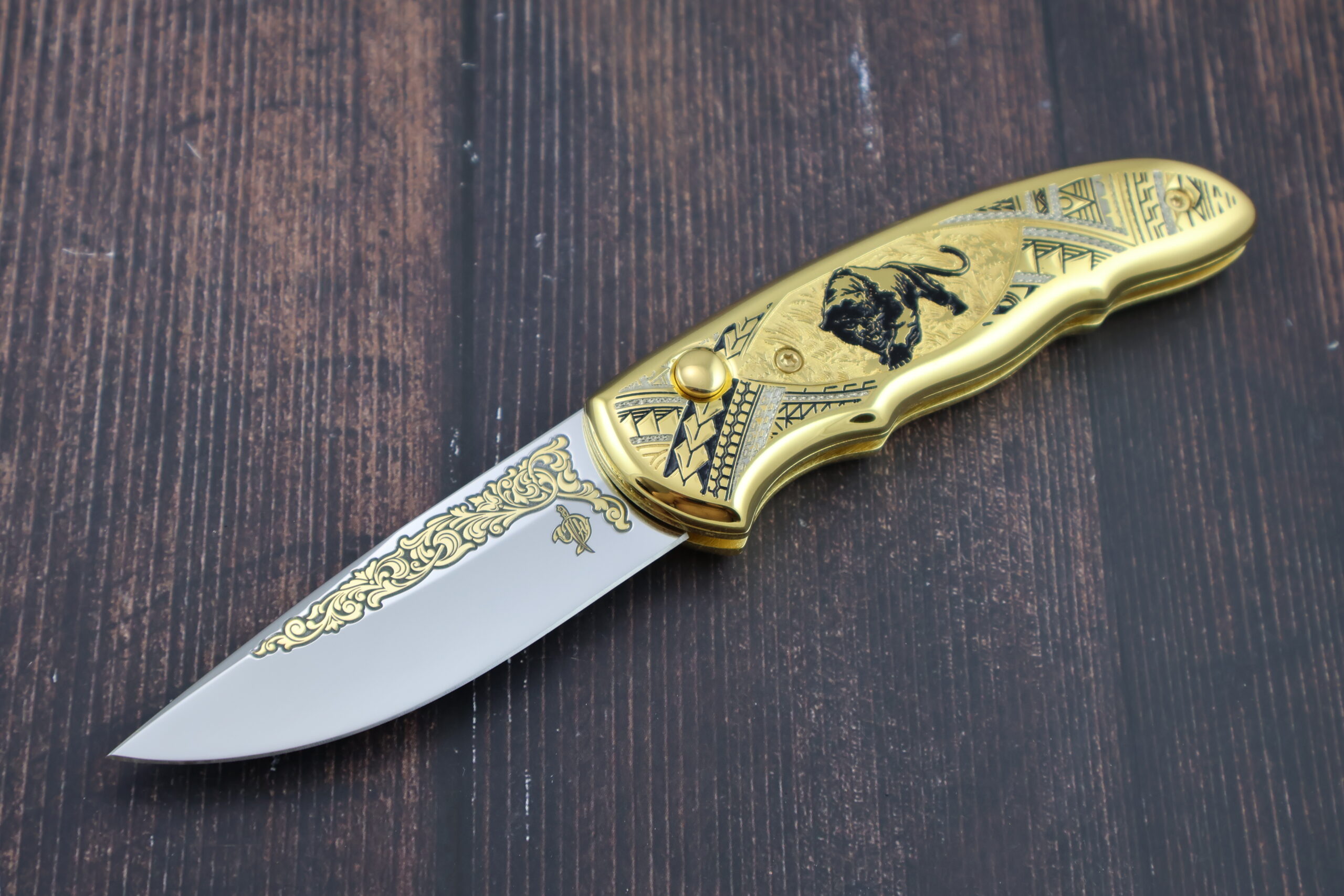 Представляем подарочный складной автоматический нож НС-1м «Чёрная пантера», изготовленный в традициях знаменитой златоустовской гравюры на стали. Изделие создано с применением золочения(используется золто 999-й пробы), никелирования и чернения. Сюжет: на металлической поверхности рукояти изображен силуэт чёрной пантеры на фоне растительного орнамента и геометрических узоров. Клинок выполнен из высококачественной кованой нержавеющей стали ЭИ-107. Только, взяв в руку и испытав неоднократно, можно по достоинству оценить красоту и надежность нашего изделия. Это отличный подарок для каждого мужчины!