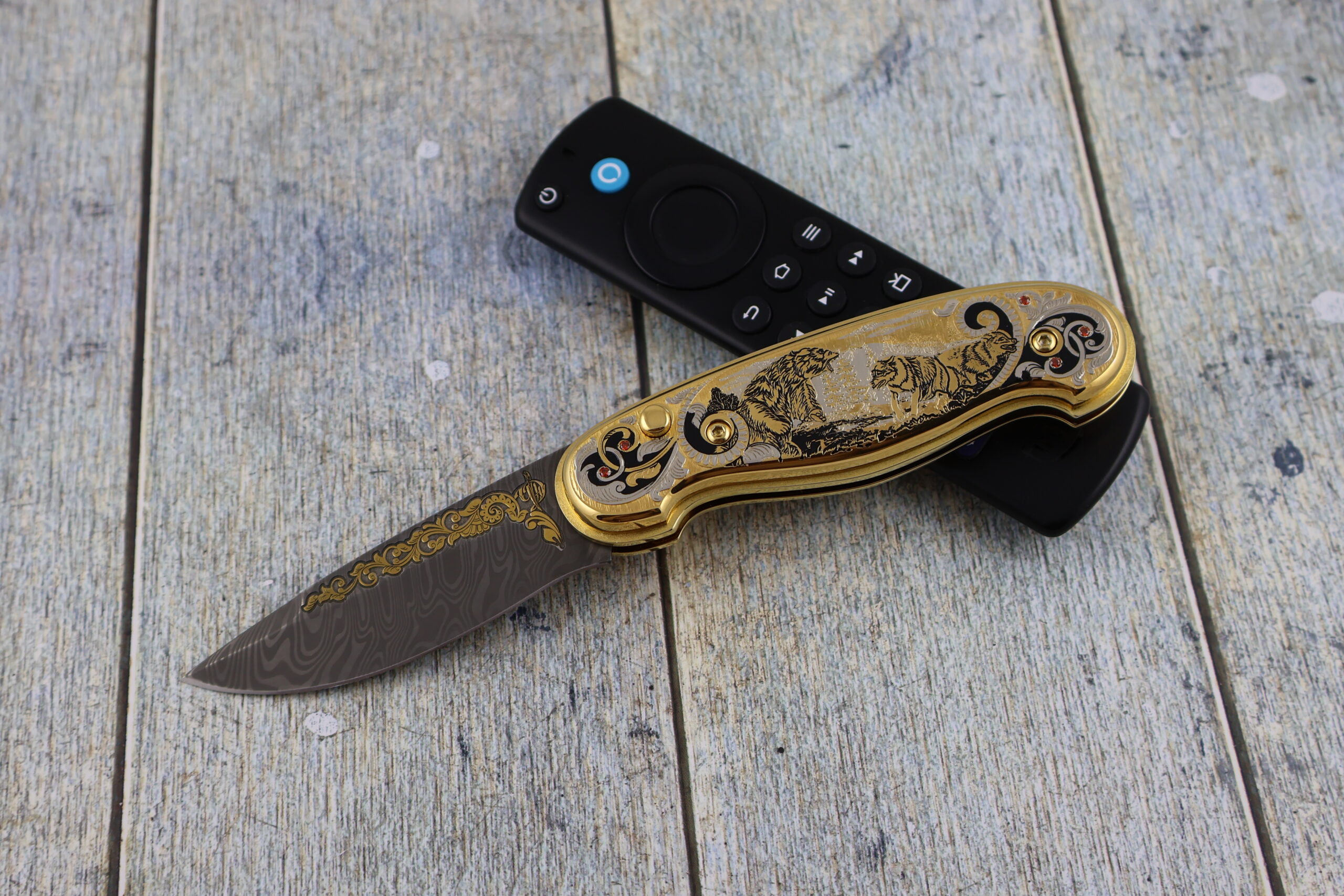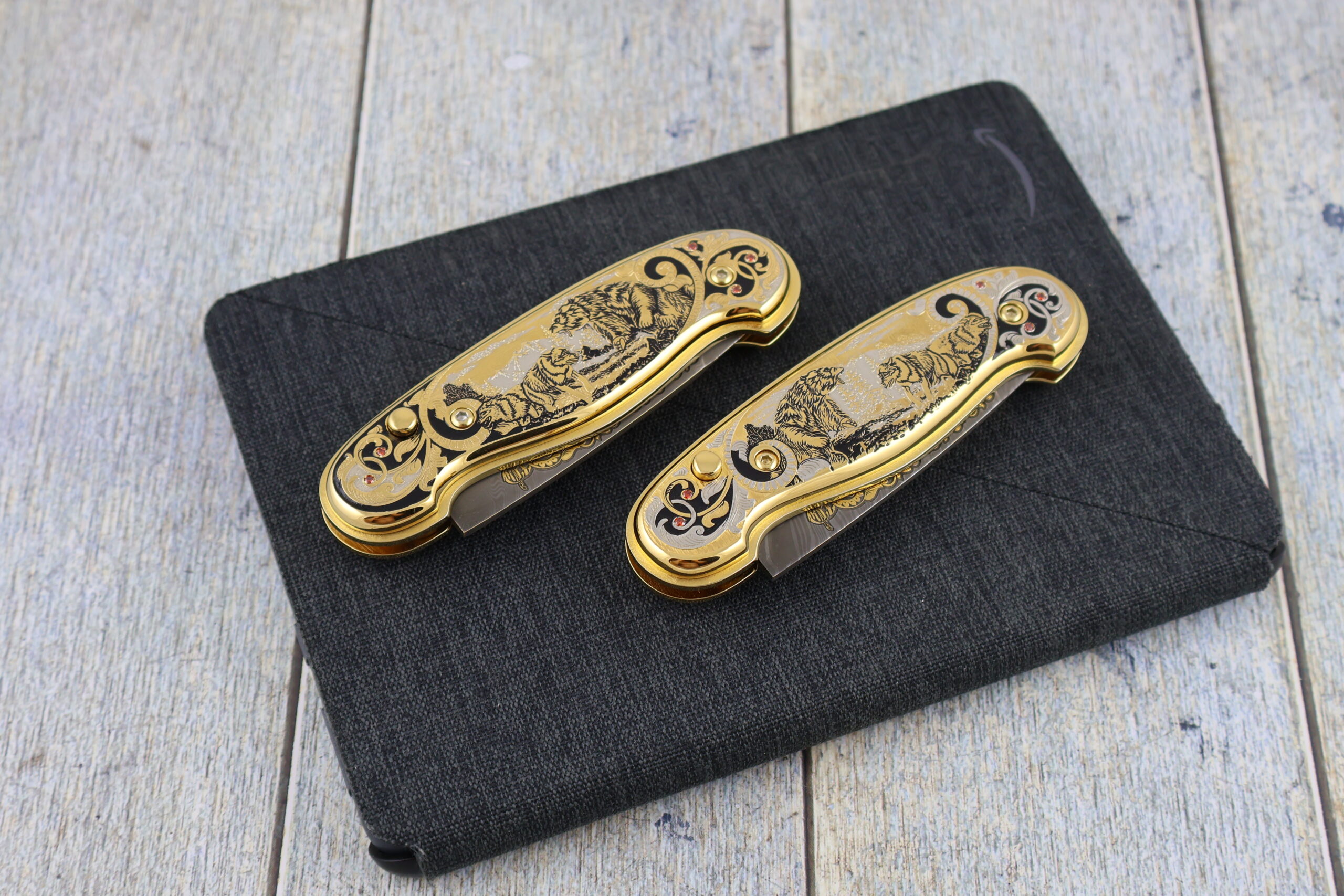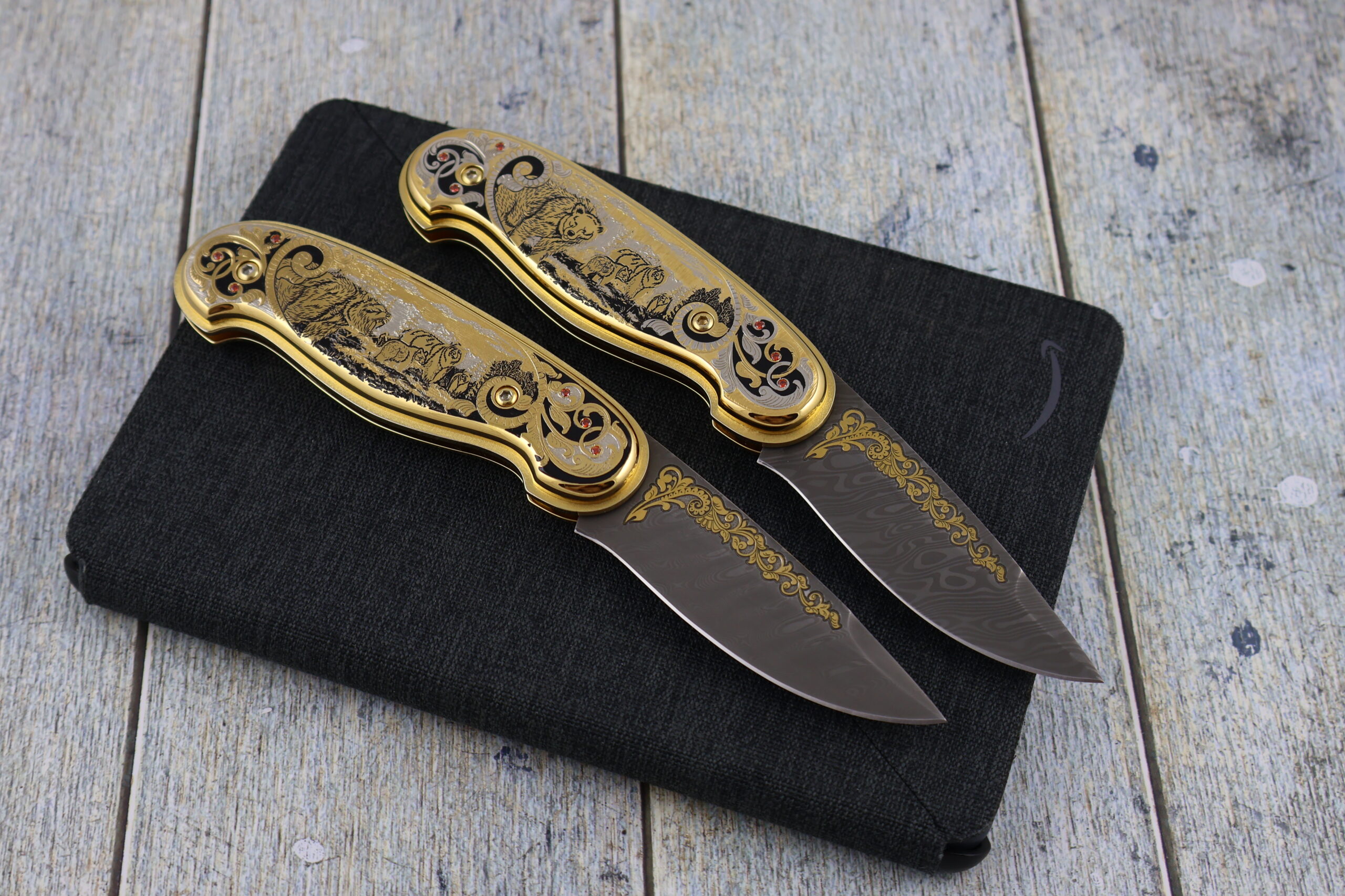 Нож складной автоматический НС-2м «Медведи и волки» является уникальным изделием! Механизм ножа обеспечивает быстрй вылет и жесткую фиксацию лезвия. Рукоять украшена сложной многоступенчатой гравировкой. В центре композиции изображены волки и медведи на фоне леса. Клинок ножа изготовлен из высококачественного нержавеющего дамаска производства «АиР». Твердость клинка составляет 60 HRC. Рукоять выполнена из латуни. Это эксклюзивный нож, выполненный в традиционном стиле златоустовской гравюры на металле.