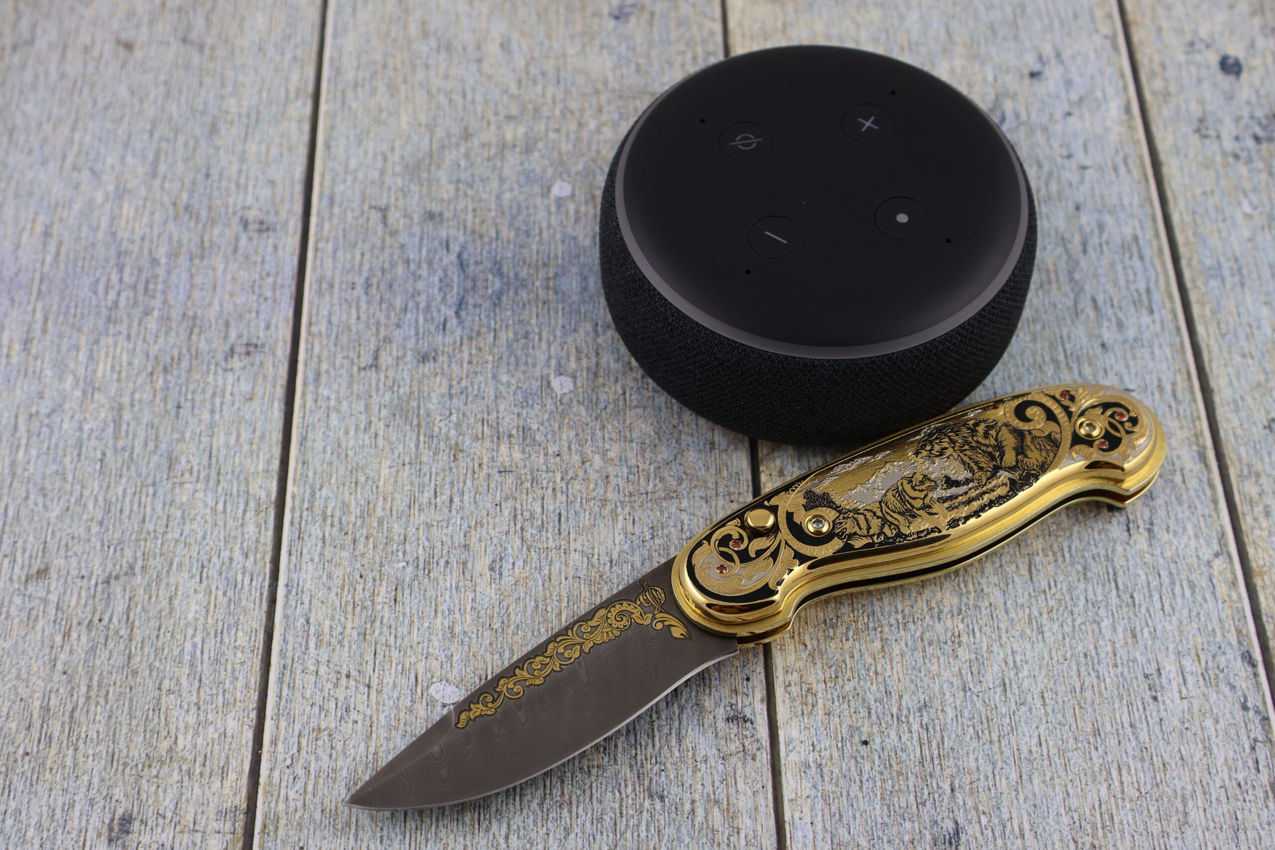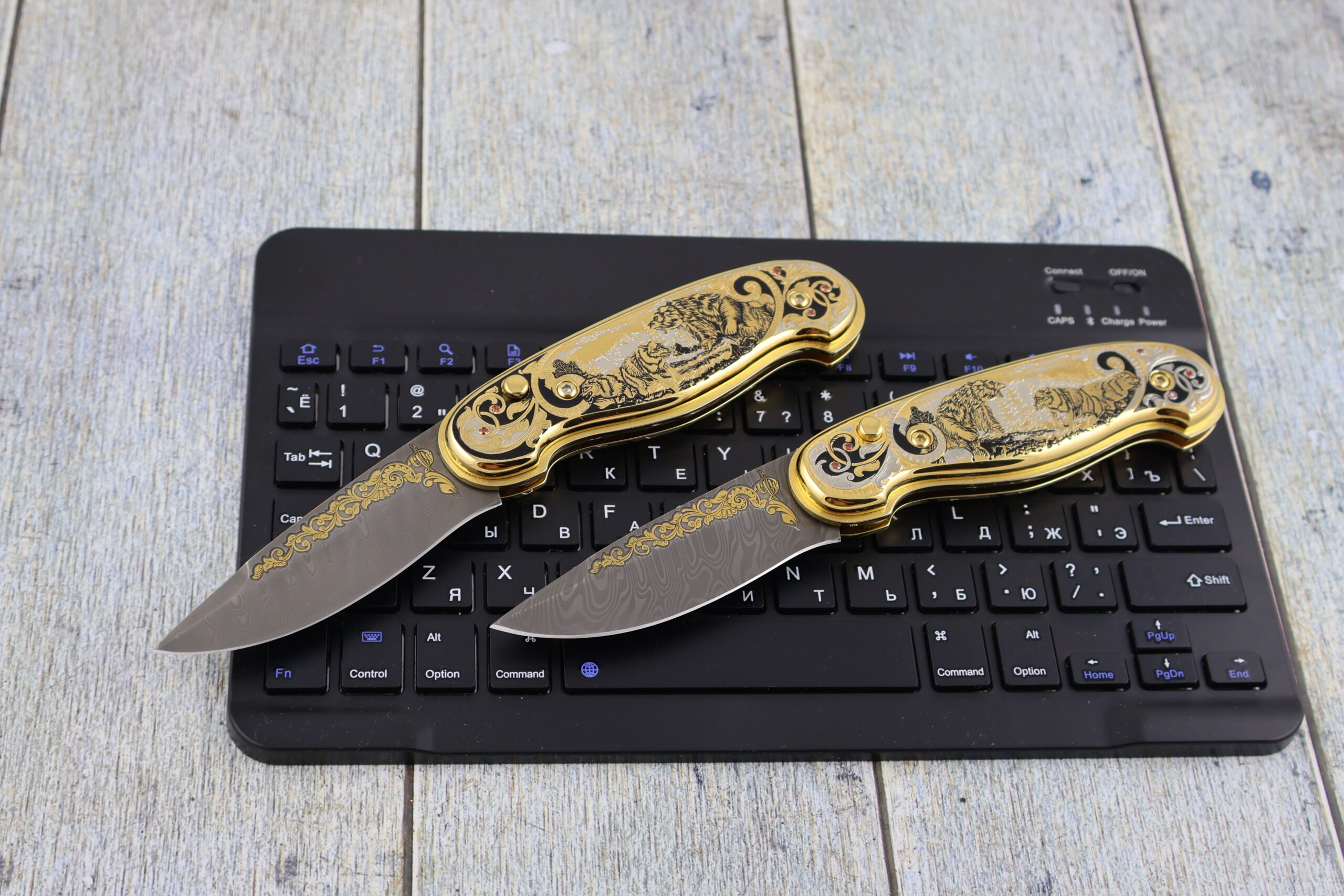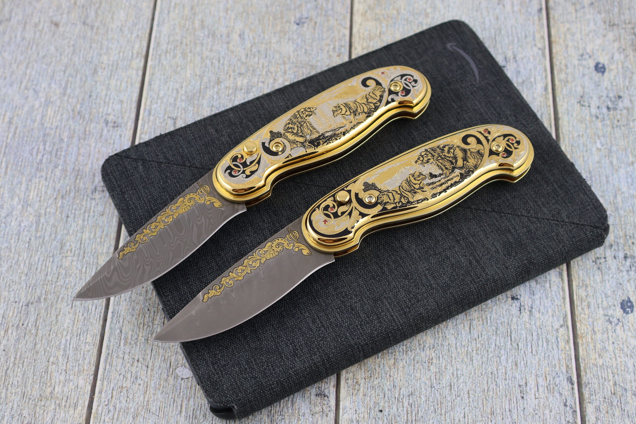 Нож складной автоматический НС-2м «Медведи и волки» является уникальным изделием! Механизм ножа обеспечивает быстрй вылет и жесткую фиксацию лезвия. Рукоять украшена сложной многоступенчатой гравировкой. В центре композиции изображены волки и медведи на фоне леса. Клинок ножа изготовлен из высококачественного нержавеющего дамаска производства «АиР». Твердость клинка составляет 60 HRC. Рукоять выполнена из латуни. Это эксклюзивный нож, выполненный в традиционном стиле златоустовской гравюры на металле.