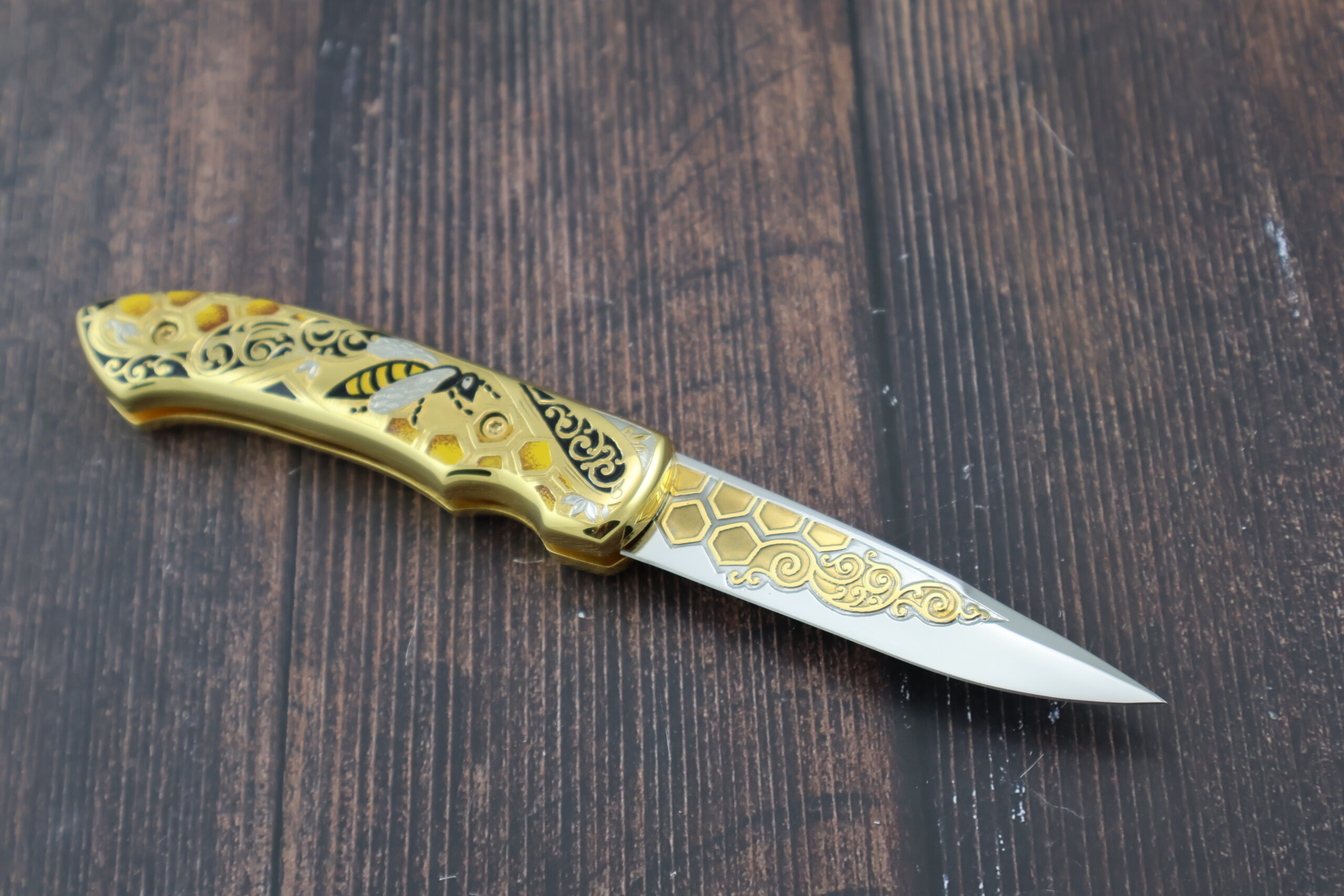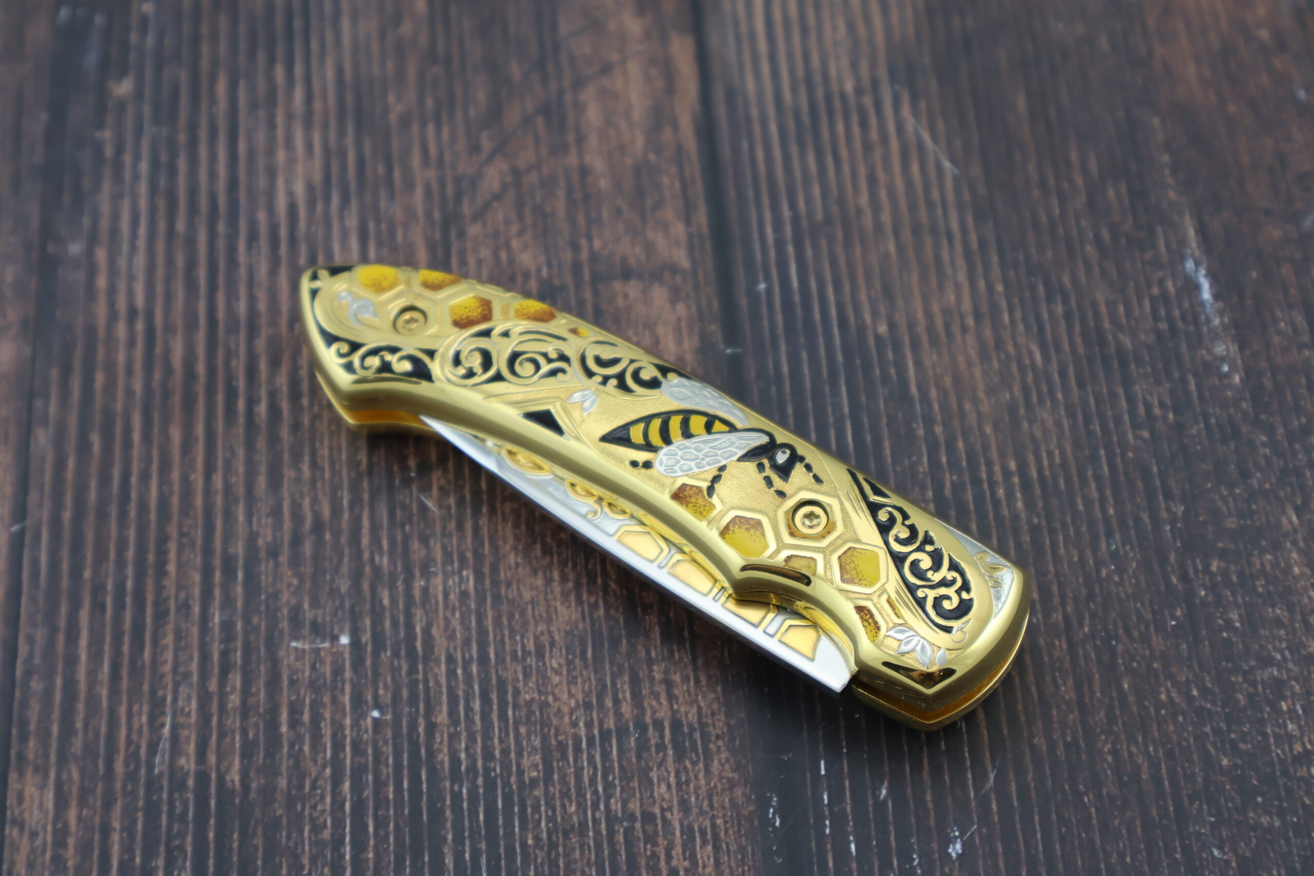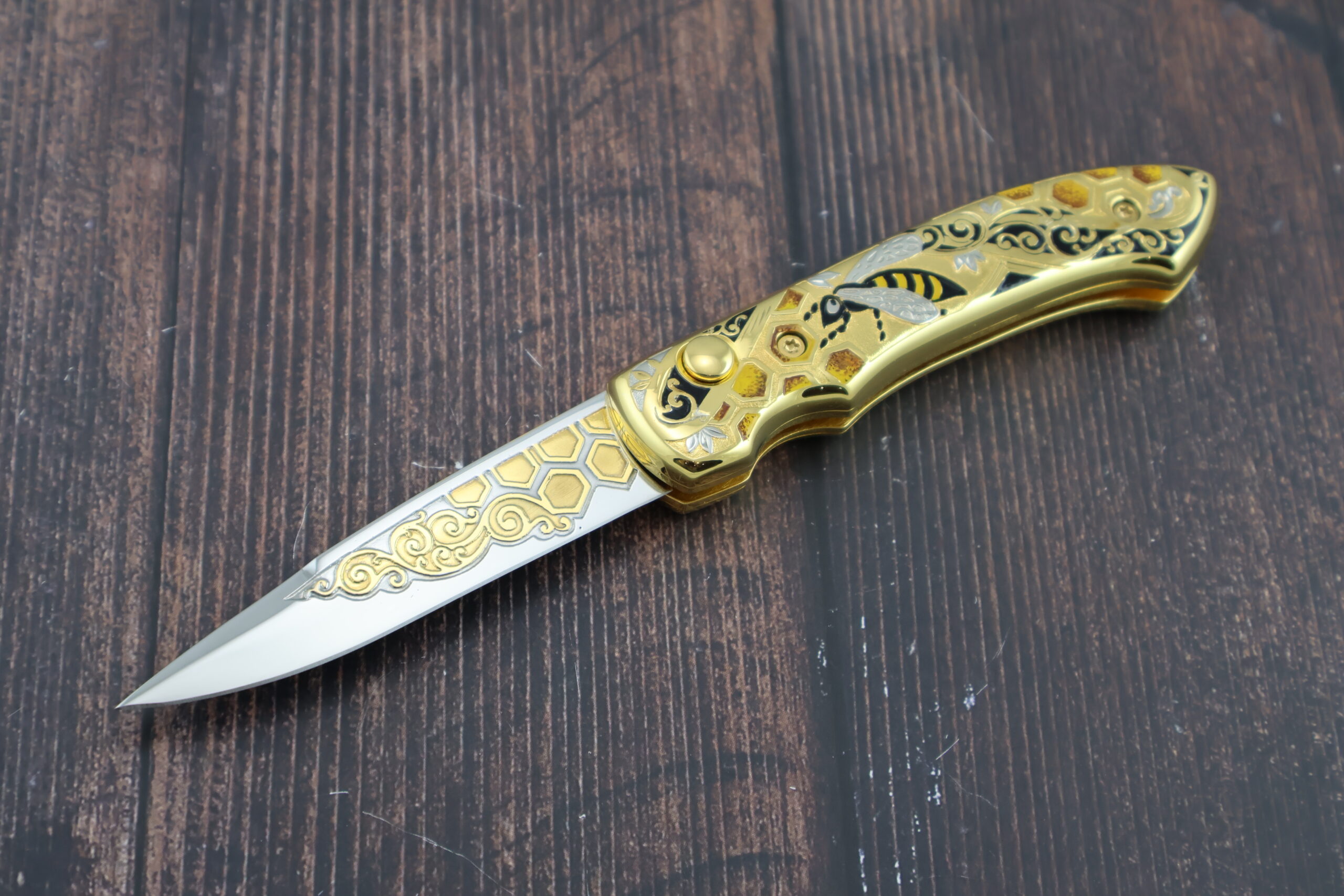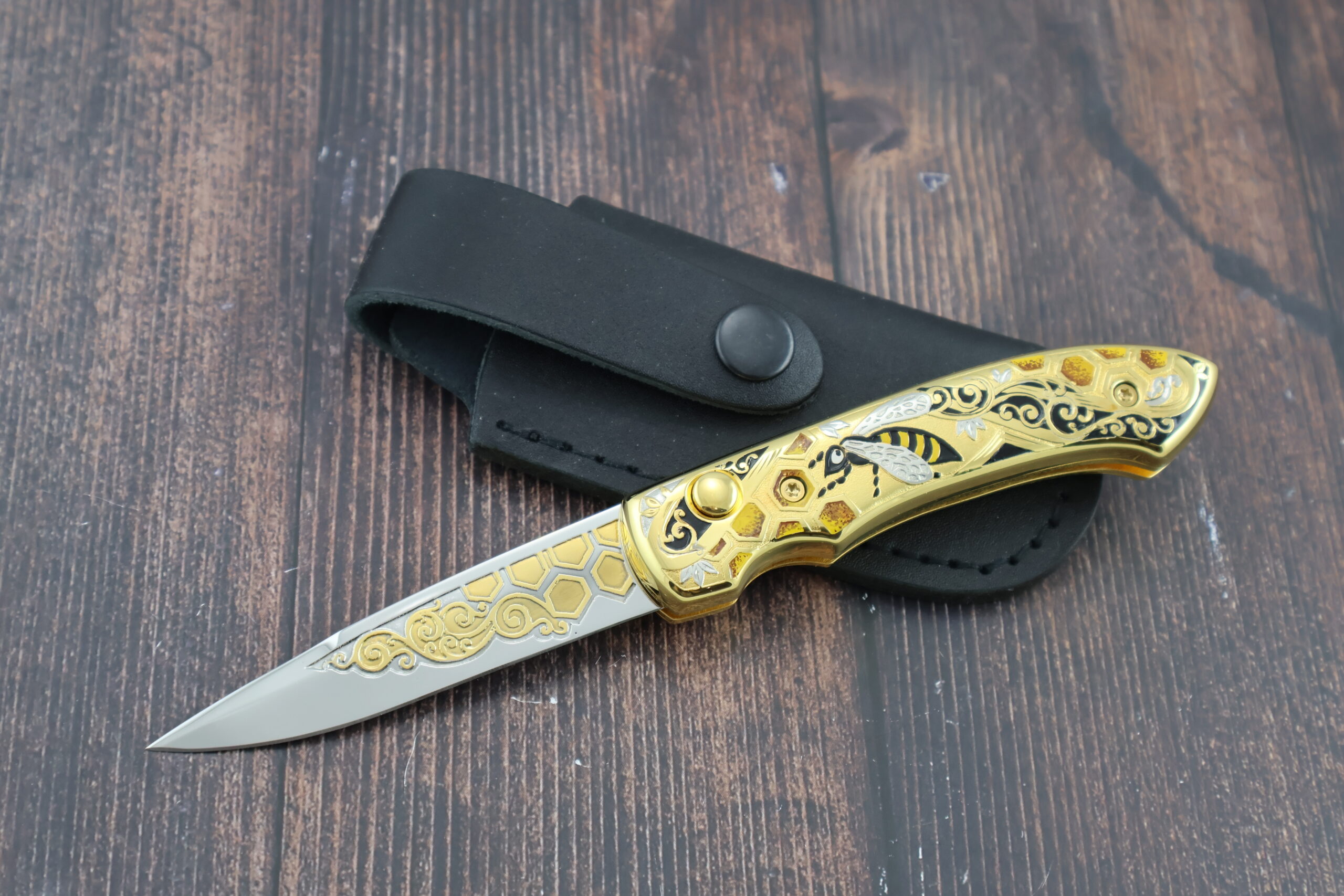 Нож складной автоматический НС-5 «Пчела», несомненно одна из наших лучших работ. Украшение ножа выполнено в лучших традициях златоустовской гравюры. Механизм ножа обеспечивает быстрый вылет и жесткую фиксацию лезвия.  Рукоять и клинок украшены позолотой и никелированием с использованием сложной техники рисования кистью, травления и гравировки. На рукояти изображена пчела на фоне пчелиных сот, что является отличительной чертой данного ножа и подчеркивает его эксклюзивность. Кроме того, это стильный и практичный нож. Безусловно данный нож будет лучшим подароком для каждого мужчины! Да и женщины его оценят!