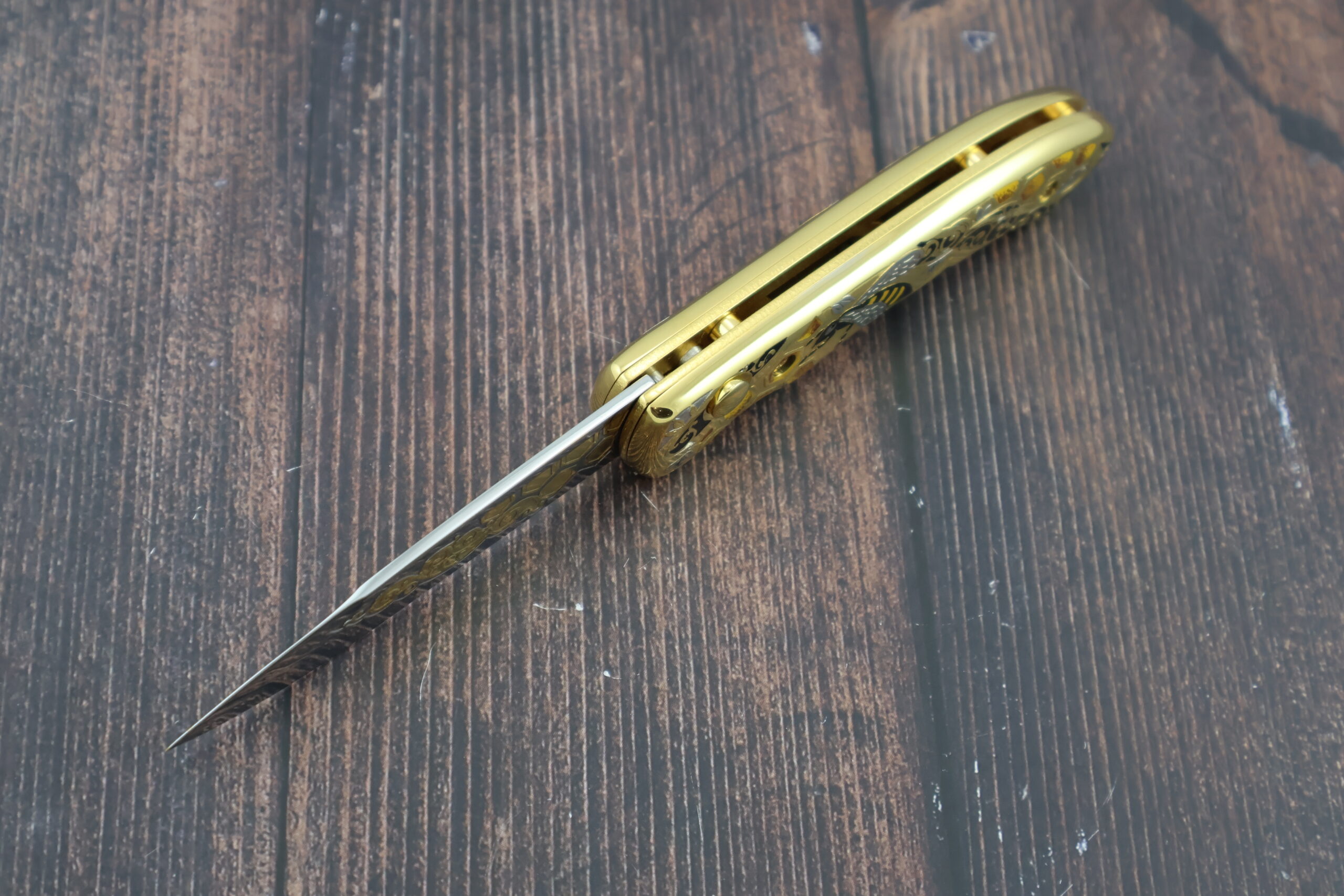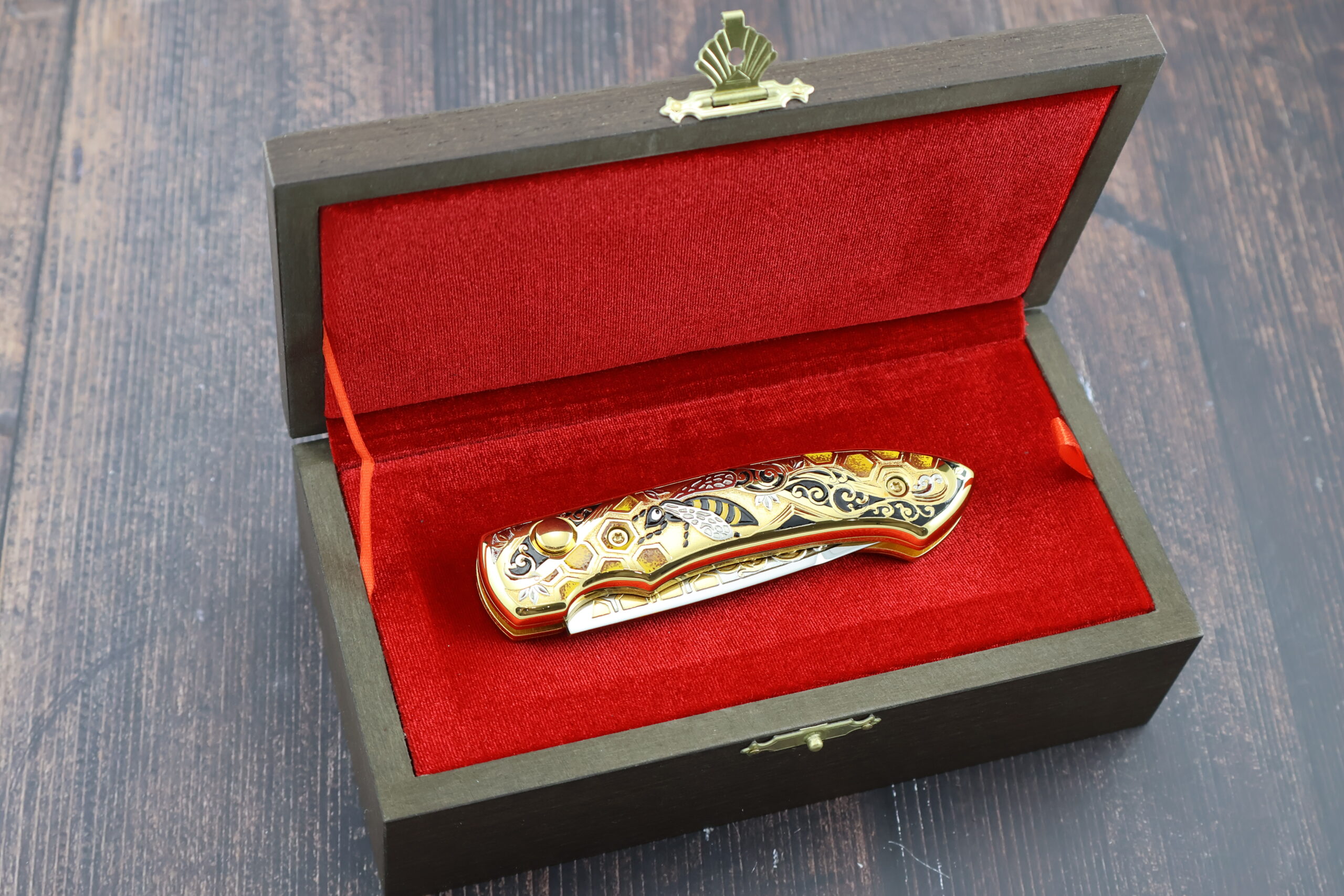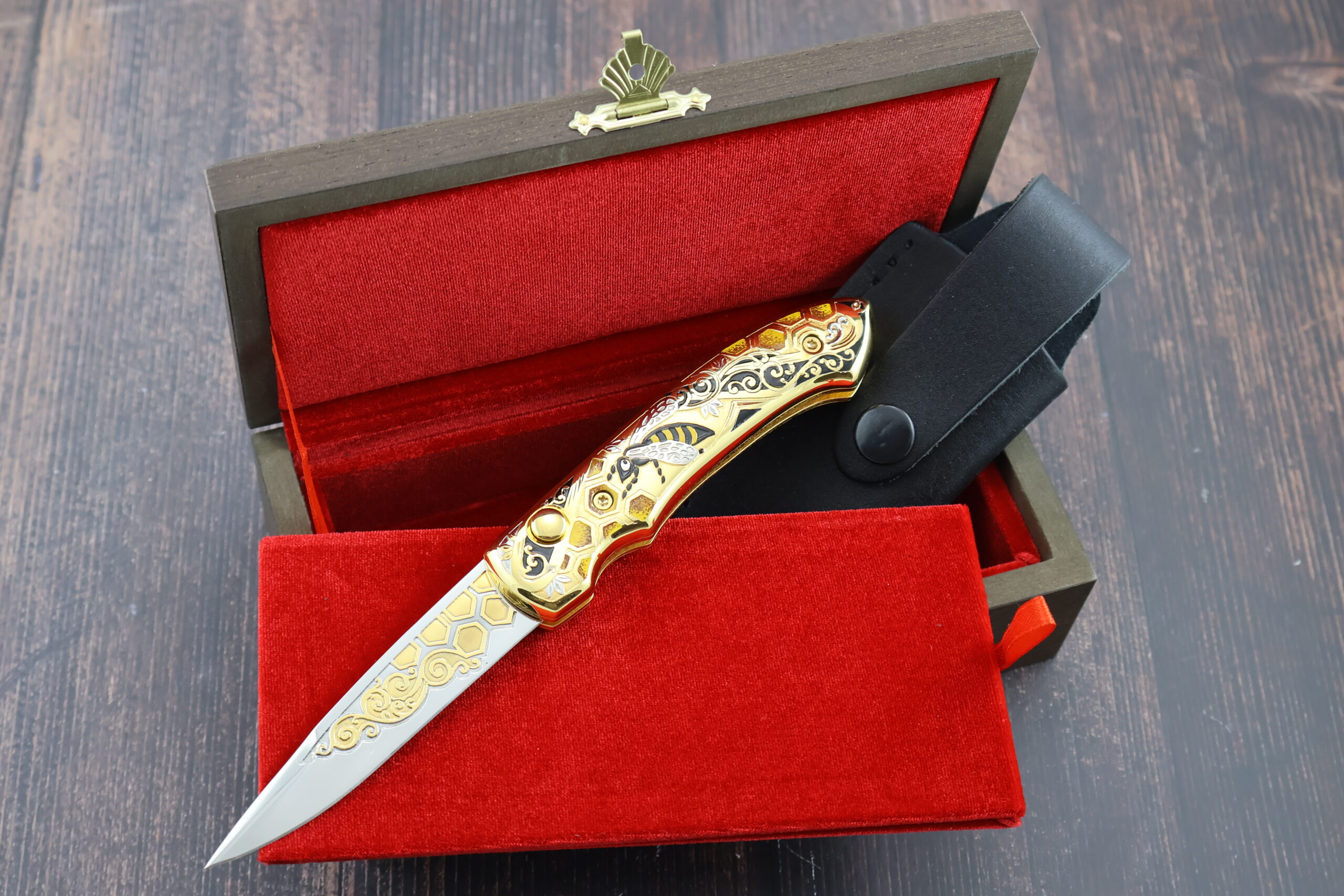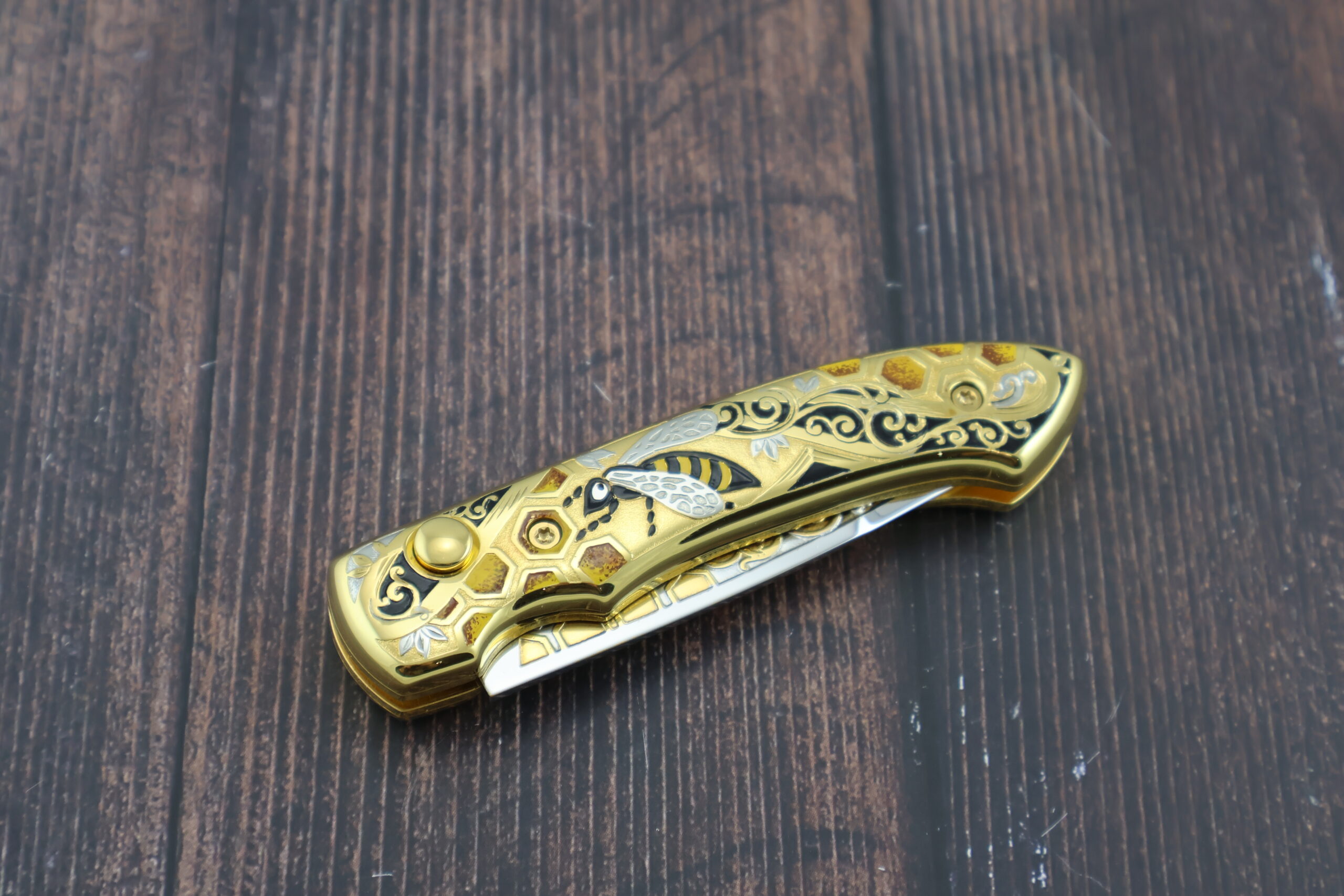 Нож складной автоматический НС-5 «Пчела», несомненно одна из наших лучших работ. Украшение ножа выполнено в лучших традициях златоустовской гравюры. Механизм ножа обеспечивает быстрый вылет и жесткую фиксацию лезвия.  Рукоять и клинок украшены позолотой и никелированием с использованием сложной техники рисования кистью, травления и гравировки. На рукояти изображена пчела на фоне пчелиных сот, что является отличительной чертой данного ножа и подчеркивает его эксклюзивность. Кроме того, это стильный и практичный нож. Безусловно данный нож будет лучшим подароком для каждого мужчины! Да и женщины его оценят!